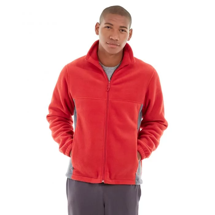 • Red full zip fleece with gray insets.